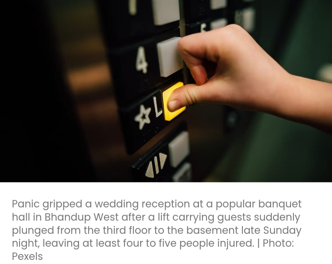 भांडुप वेडिंग हॉल में लिफ्ट तीसरी मंजिल से तहखाने में गिरी, कई लोग घायल; लापरवाही का आरोप………