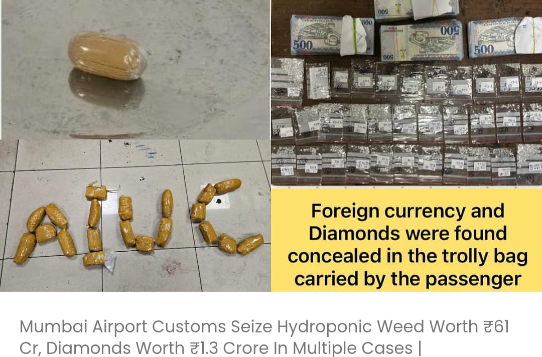 मुंबई हवाई अड्डे के सीमा शुल्क विभाग ने कई मामलों में 61 करोड़ रुपये मूल्य की हाइड्रोपोनिक भांग और 1.3 करोड़ रुपये मूल्य के हीरे जब्त किए……….