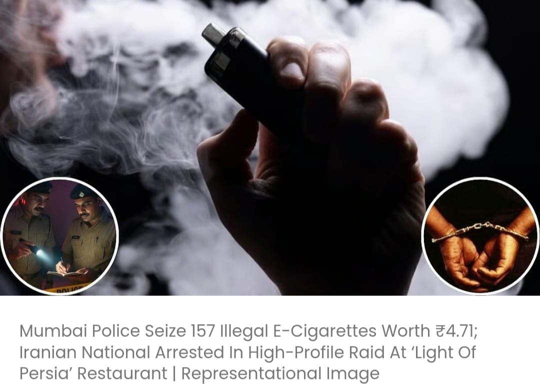 मुंबई पुलिस ने ₹4.71 मूल्य की 157 अवैध ई-सिगरेट जब्त कीं; ‘लाइट ऑफ पर्शिया’ रेस्तरां पर हाई-प्रोफाइल छापेमारी में एक ईरानी नागरिक गिरफ्तार……..,